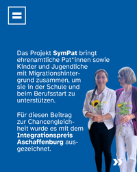 Das ehrenamtliche Lernhilfeprojekt „Sympat“ war unter den Preisträgern und erreichte den vierten Platz. SymPat ist ein Patenprojekt, das Kinder und Jugendliche mit Migrationshintergrund und ehrenamtliche Paten zusammenbringt. Durchgeführt wird es von einem unserer Fachdienste, dem Jugendmigrationsdienst des Paritätischen in Unterfranken / Dienststelle Aschaffenburg.